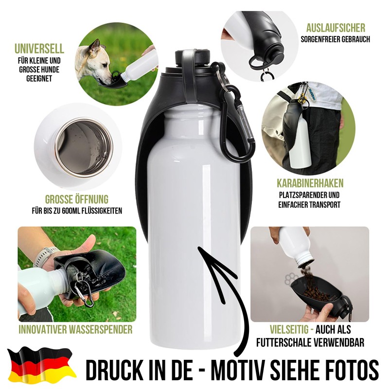 - DRUCK MADE IN GERMANY: Die Hundetrinkflaschen werden in Deutschland in Kleinserie bedruckt und veredelt, mit viel Liebe zum Detail und gestochen scharfen Farben. Bitte per Handwäsche reinigen, um das Motiv zu schützen