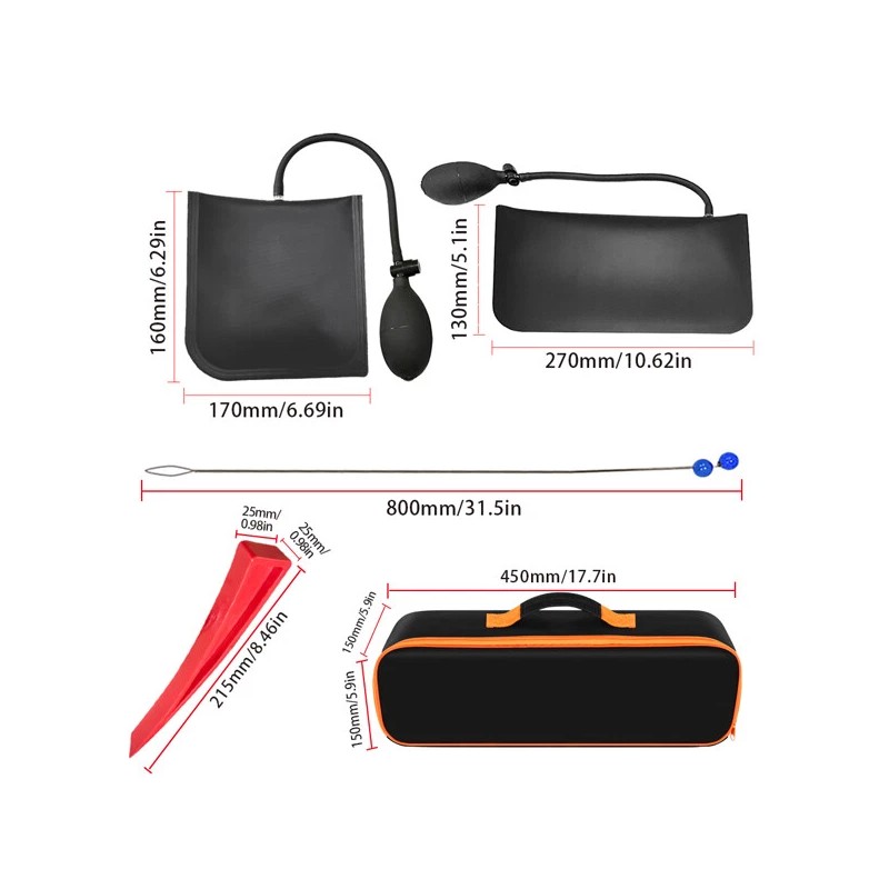 High-quality tools PVC environmental protection nylon seesaw, not easy to break, more and more convenient to disassemble vehicle instrument panel, audio panel, door side panel, roof and other decorative boards and accessory box covers, Equipped with 2 black airbags.Our air wedge pumps are made of high-quality TPU material, with smooth external and internal reinforcing ribs and PVC inserts inside, which makes it easier to insert into gaps to resist greater pressure. They can be used in homes and cars.