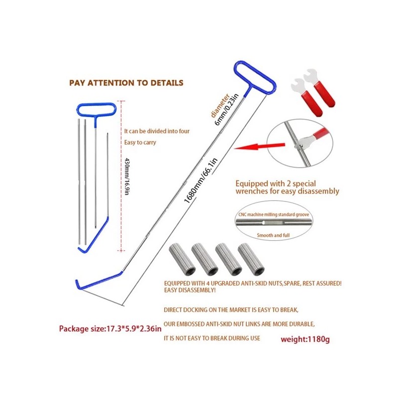 Expansion tool: Solid 202F stainless steel, assembled in four parts, and the maximum length after assembly is 67 inches. With anti-slip soft rubber handle and barb protection, there is no need to worry about scratching the paint surface. CNC machine tools mill standard slots, which perfectly match the wrench caliber, and it is more convenient to disassemble the rod with a wrench.