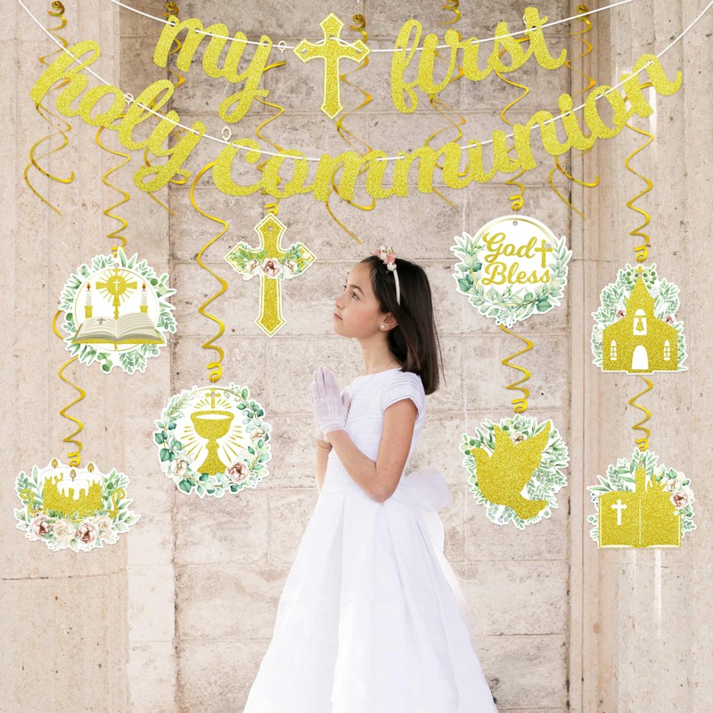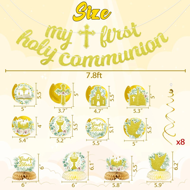 - First Communion Decorations:Includes 2pcs glittery banners,16pcs hanging swirls(8 with cards),4pcs honeycombs