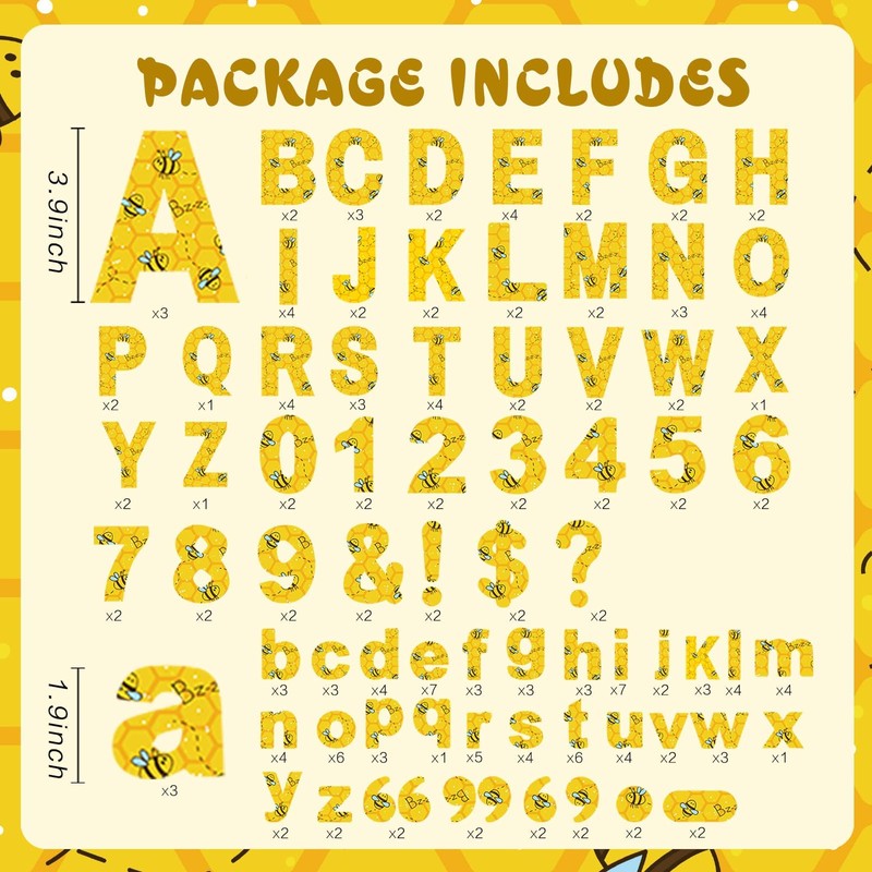 • Widely Used:Our bee alphabet and number cutouts can add some elements to classroom bulletin boards, chalkboards, walls, doors to create an atmosphere for spring birthday parties and holiday parties; you can also add them to your DIY projects or use them as photo props . You can also add them to your DIY projects or use them as photo props. You can also give them as gifts to your friends and family