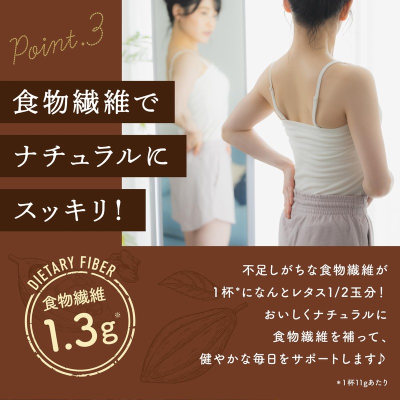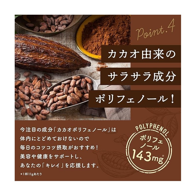 - これ1杯でたんぱく質4g、乳酸菌500億個、食物繊維1.3g、カカオポリフェノール143mg※