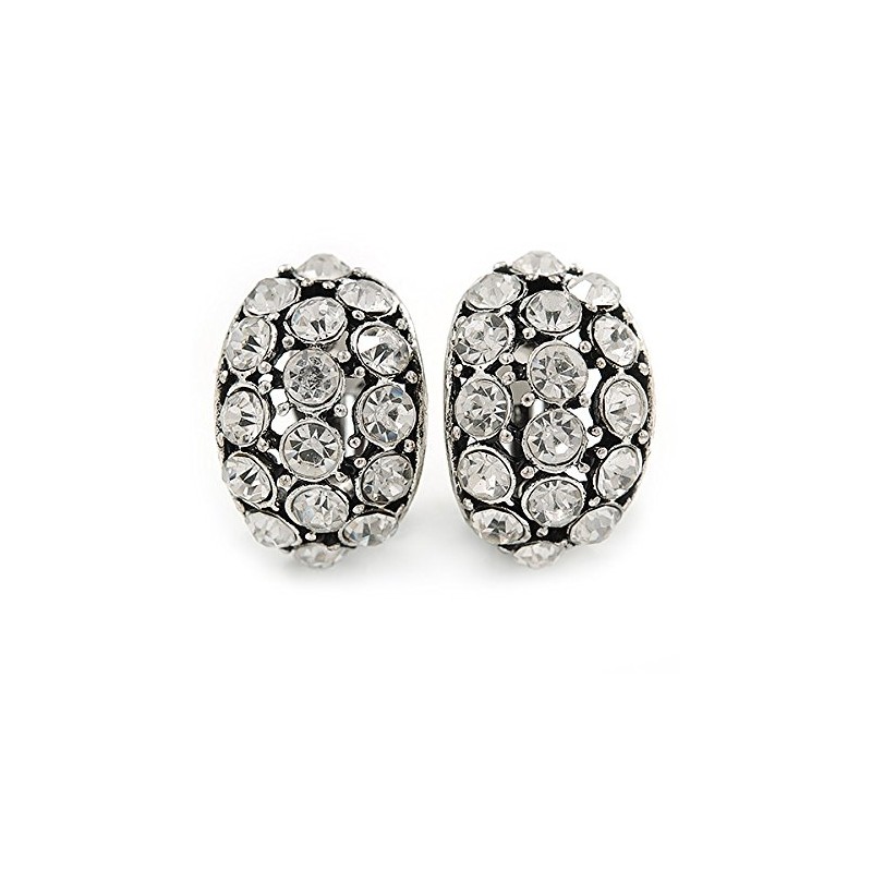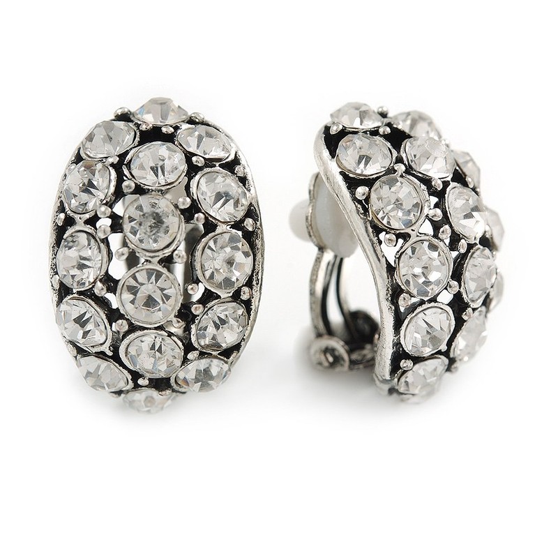 Accent day or evening wear with these bold C Shape Clear Crystal Clip On Earrings In Silver Tone Metal. Featuring a 'C' shape design, crafted in aged silver tone metal and accented with clear crystals providing a dazzling look. Each earring measures about 23mm L x 15mm W. Secures with a clip-on clasp to keep sensitive ears comfortable. Each earring weight is about 6g.