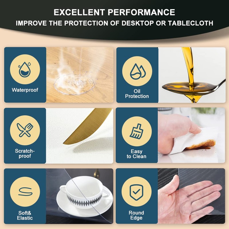- E.Multi size and shape available in clear plastic table protector and tablecloth cover, vinyl table top pad: round, square(circle) or rectangle, from small to extra large size, fit your dining table, office desk ,coffee table, sofa side bedside table, end wine tea long pub bar dinner table, bistro or banquet,work craft table, activity table, student study writing desk, cocktail table, living room accent table decoration entryway entry high table,our clear table pad is suitable for use