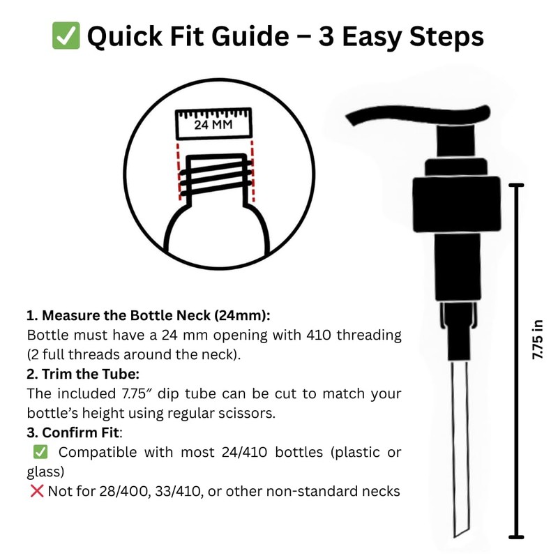 • Measure before purchasing - Perfect Fit for 24/410 Bottles Designed for bottles only with 24 mm wide necks and 410 threading (2 full turns). Commonly used for lotion, soap, shampoo, and refillable containers. See Quick Fit Guide in images for measuring instructions.
