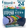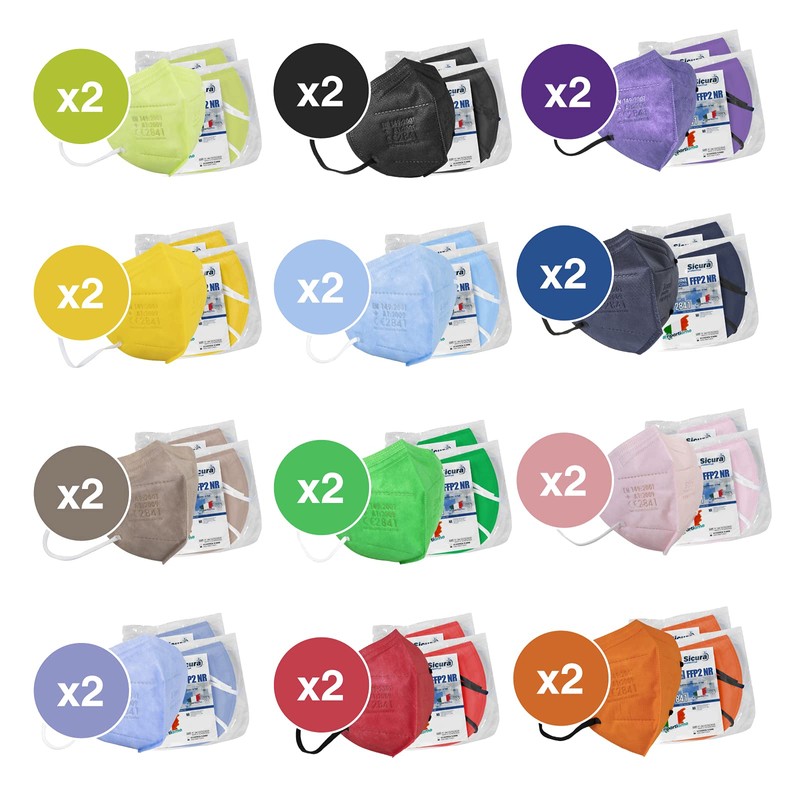 24 FFP2 Masks Colourful CE Certified Coloured Made in Italy BFE ≥99% Mix 12 Colours Blue, Orange, Red, Black, Blue, Green, Apple Green, Yellow, Turtle Doves, Purple, Pink, Lavender
