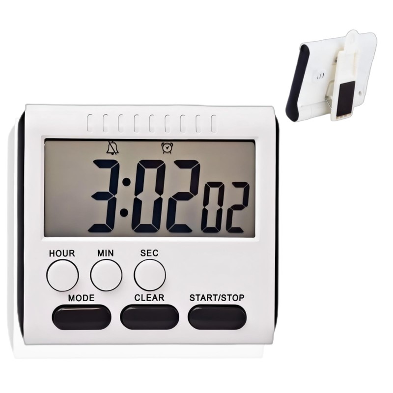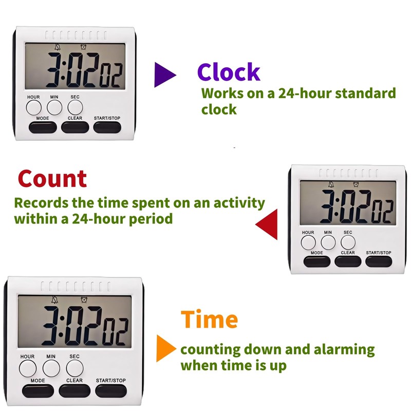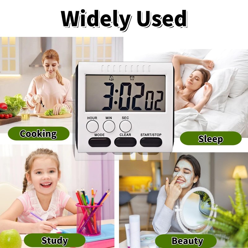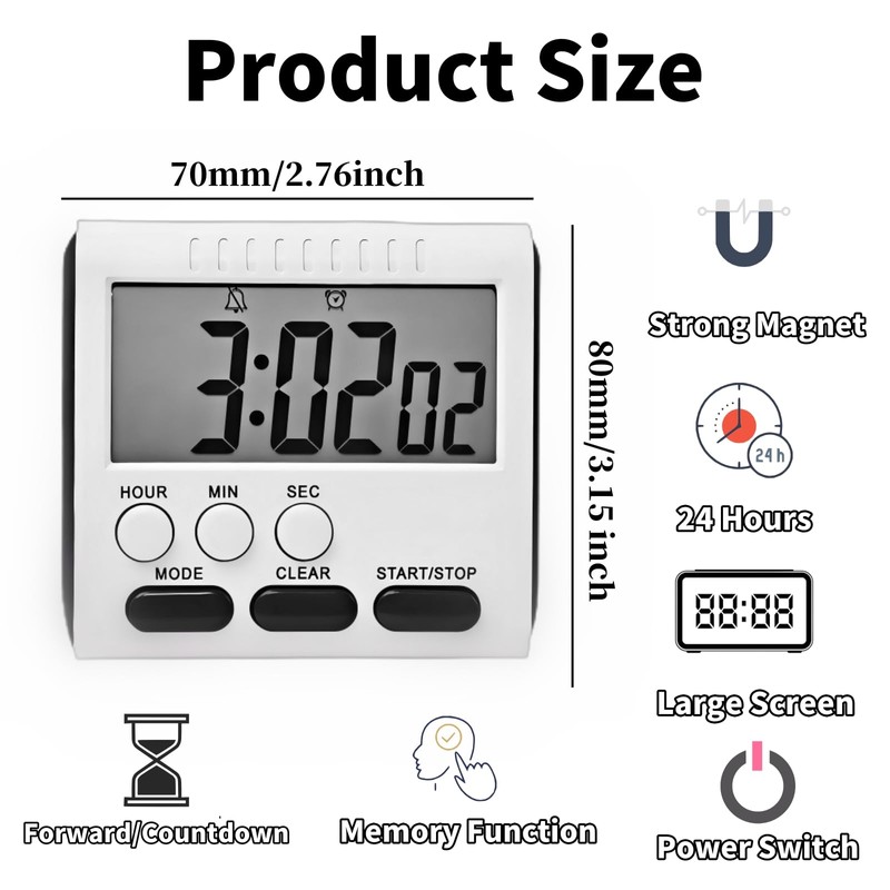 - Dual Functionality: Digital Alarm Clock + Timer with Memory:Switch seamlessly between a 24-hour alarm clock and a countdown/up timer. Save your favorite time presets with the memory storage feature