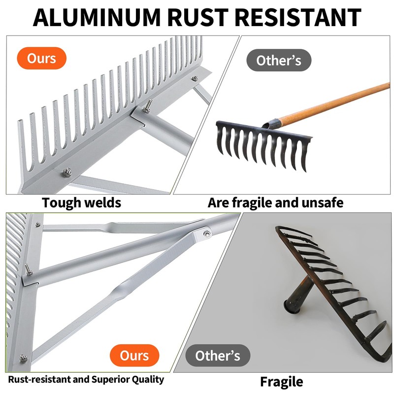 - Robust Aluminum Alloy: this 24 " landscape rake is made of professional grade high-quality aluminum. All solid aluminum head and handle are sturdy, durable, and rustproof, which will last throughout the seasons.