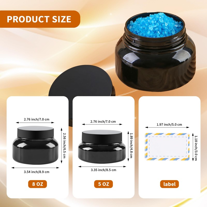 - [Perfect Size]: capacity: 5oz jars. Bottle size: bottom diameter 3.35 inches, height 1.89 inches, lid diameter 2.76 inches. Label Size:Length 1.97 inch, width 1.18 inch. Suitable for multiple occasions, very convenient for you to carry.