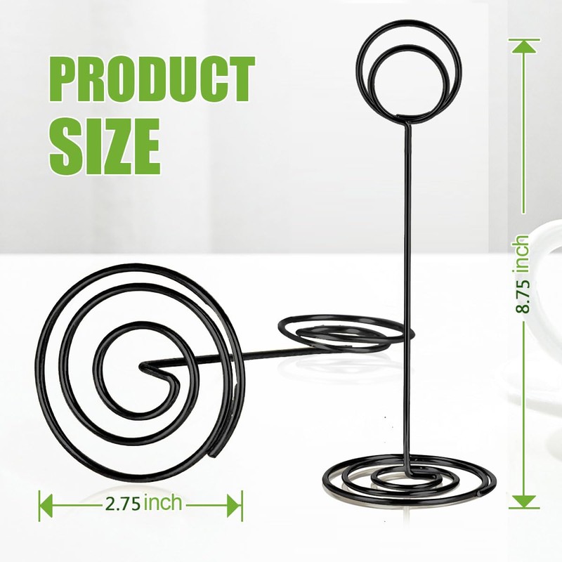 - 【UNIQUE DESIGN】: These table sign holders have a beautiful and unique design, the base is spiral with tall and vertical lines, and there are two rings on the top to hold your business card or table number firmly. The place card holder is small and cute, it makes your messy desktop tidy and organized.
