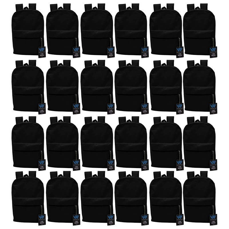 - BULK BACKPACK : Each bulk pack includes 24 backpacks. Makes a perfect gift or corporate events, donating, and more! These versatile and durable backpacks are awesome for all season use, for leisure as well as academic purposes. Measures approximately 12” (wide), 17” (tall), and 6” (depth).