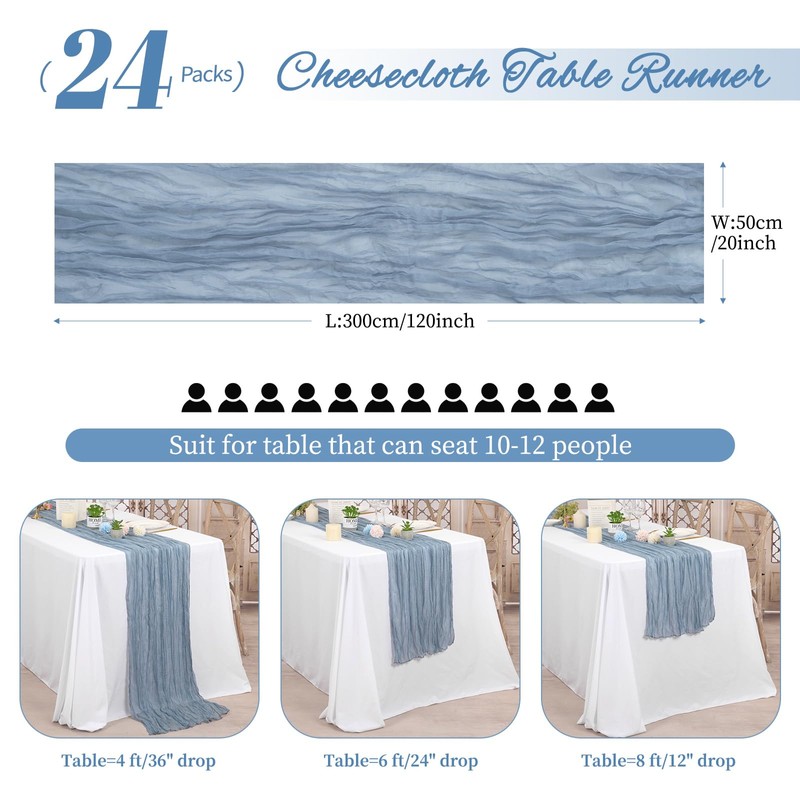 24 Pack Dusty Blue Cheesecloth Table Runner,10ft Gauze Table Runner Long Semi-Sheer Rustic Boho Table Runners for Wedding,Bridal Shower,Party,Banquet Decoration(24 Pcs-21.5 x 120 Inch/Dusty Blue)