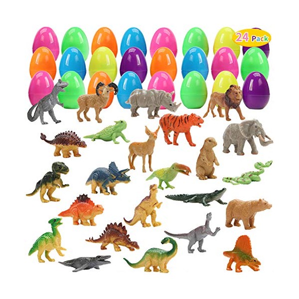 - 24 Prefilled Easter Eggs: Each egg is 2*2.8 inch in size. There are 4 colors of Easter eggs, each with 6 eggs. The colorful Easter eggs are filled with 12 mini dinosaurs and 12 mini wild animals.