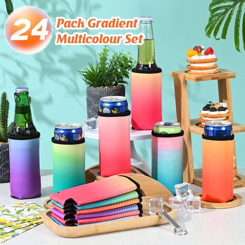 - What's Set Included: Including 24 Gradient multicolour insulated slim can cooler, including various solid color schemes suitable for summer, suitable for various 12oz skinny tall can beer or soda cans or bottles, perfectly fits most popular drinks in the market.