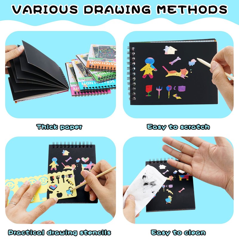 - 🌸Premium Materials: Our rainbow scratch note pads are made of high quality paper materials, each sheet has a rainbow holographic color layer hidden under the black matte coated safe, no smell, thick and not easy to tear. Kids can play, think, test and prepare their masterpieces and enjoy the art of scratching.