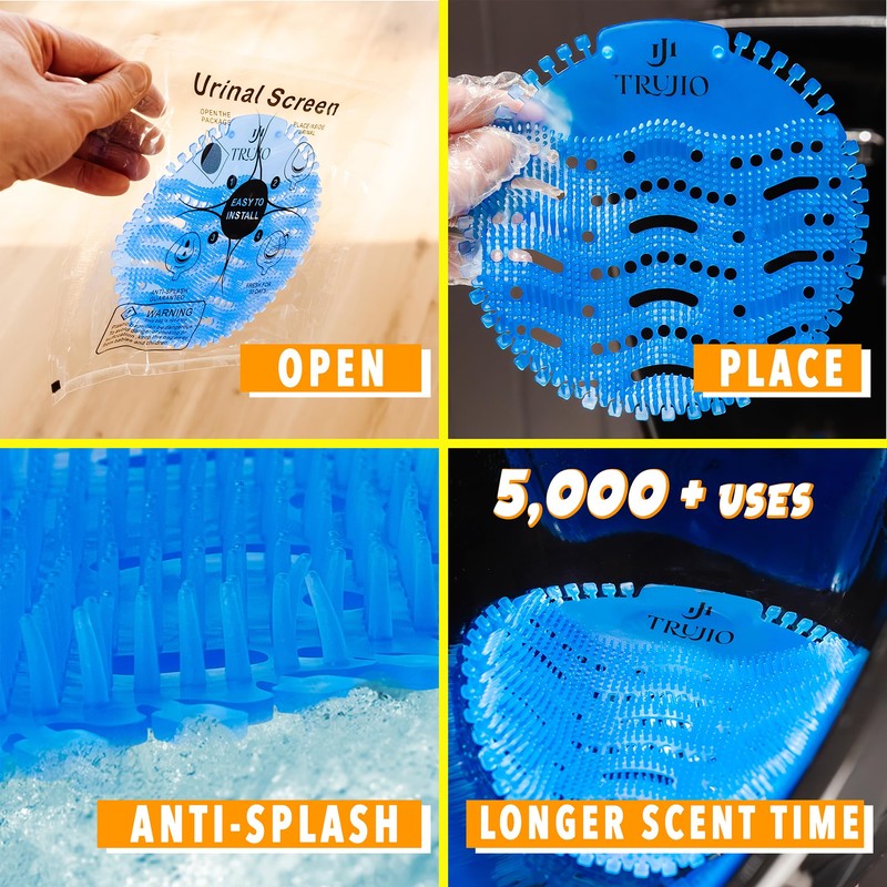 - Includes 24 Packs Gloves - Dreading the monthly urinal cake replacement? Trujio urinal screens include 24 pairs of gloves to make routine maintenance sanitary and stress-free. No need to handle urinal pads in the raw. Just pop on a pair of gloves and avoid the ick.