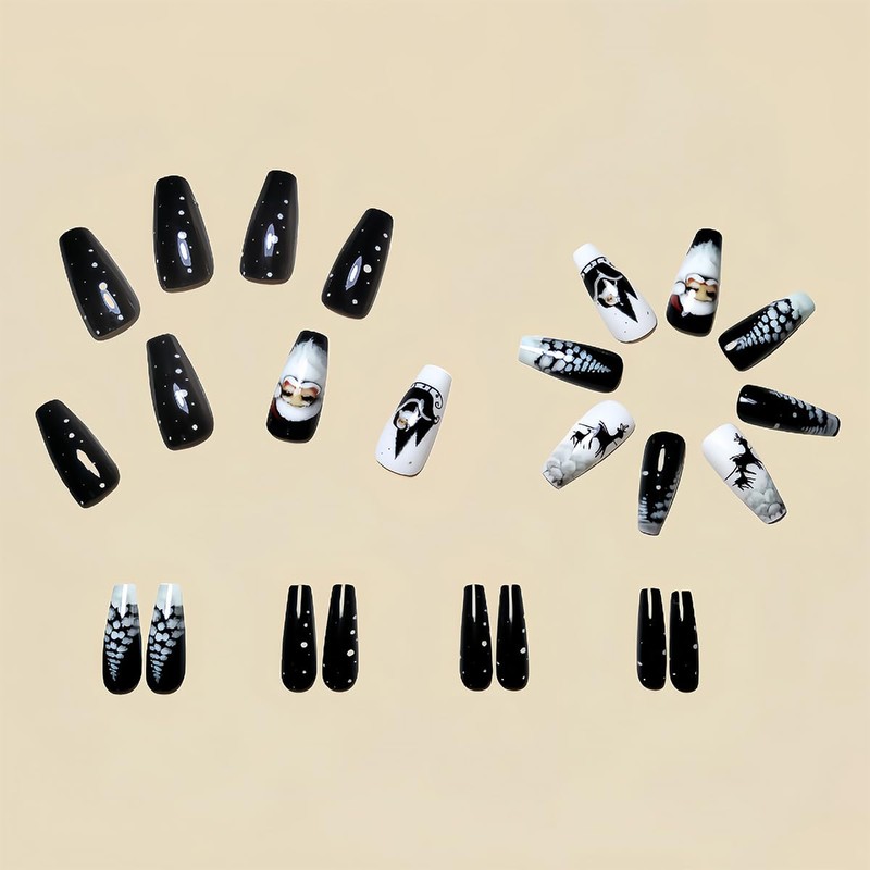 Christmas Press on Nails Long Coffin Fake Nails Black Glossy False Nails with Winter Santa Claus Snowflake Elk Design Xmas Acrylic Nails Full Cover Christmas Stick on Nails for DIY Nail Art