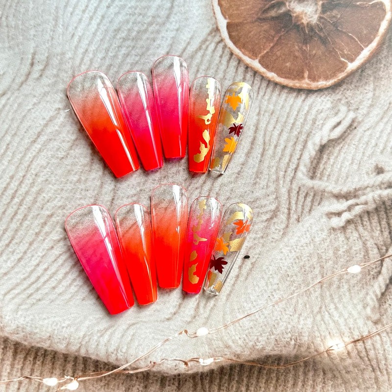 24 Pcs Fall Press on Nails Long Coffin Ballerina Fake Nails Red Gradient Full...