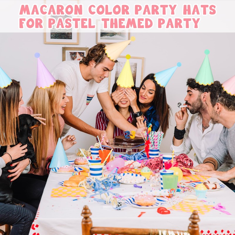 - Lovely Design: These pastel party hats come in a variety of bright and cheerful colors, each one adding a touch of fun and festivity to any celebration. The adorable pom-pom holder on top adds a touch of charm and whimsy, making them the perfect accessory for birthday parties for adults and children alike. Not only are these hats stylish, but they're also practical, ensuring everyone can get in on the festive spirit with a playful, coordinated look.