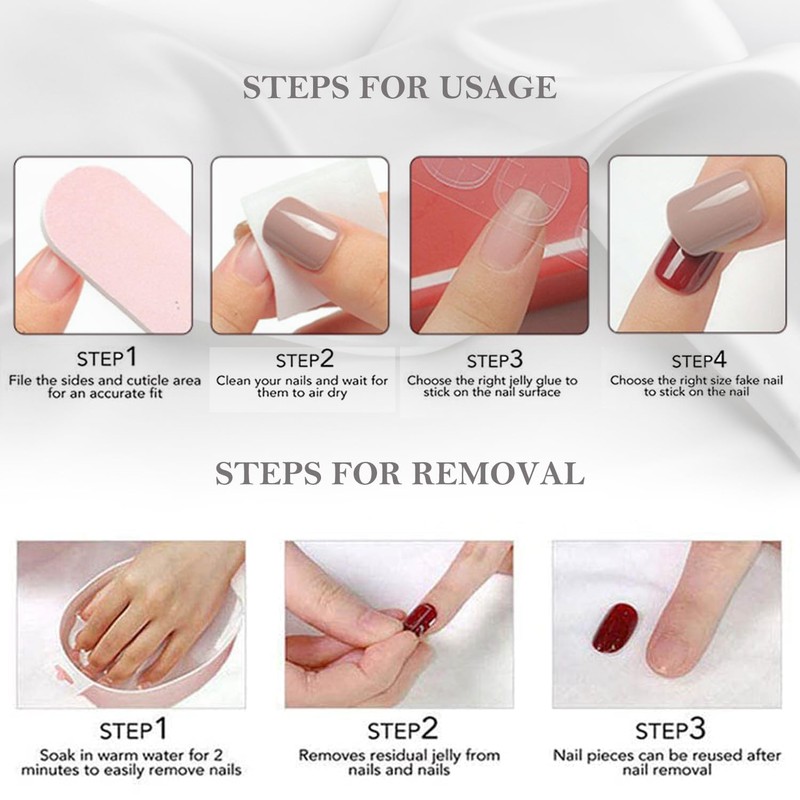 3.Please note that the nail glue is not included.If you want it last for a longer time,please use nail glue instead of the jelly glue stickers.