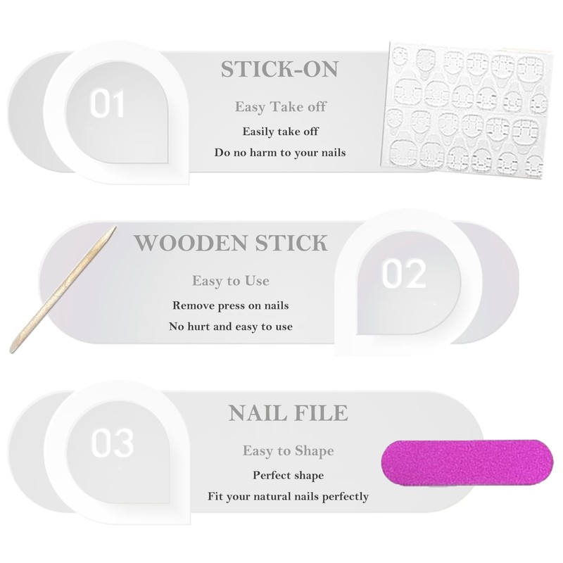 - HIGH QUALITY PRESS ON NAIL KIT - You will get 24 pcs fake nails, 1 gel nail glue sticker, 1 nail file, 1 cuticle stick, 12 sizes, short false nails for your everyday needs to get beautiful fast, make yourself a nail art in few minutes
