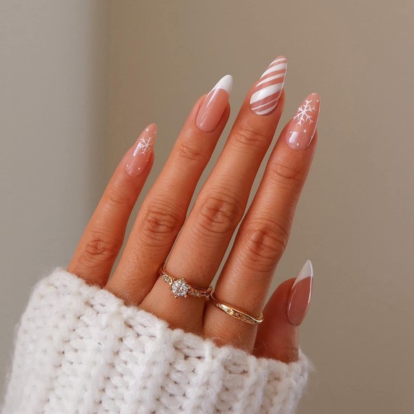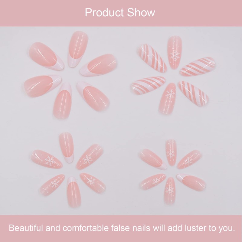 24 PCS Press on Nails White Edge Fake Nails Medium Fake Nails Snowflake Fake Nails Geometric Striped Fake Nails Wearable Fake Nails Gifts for Women and Girls