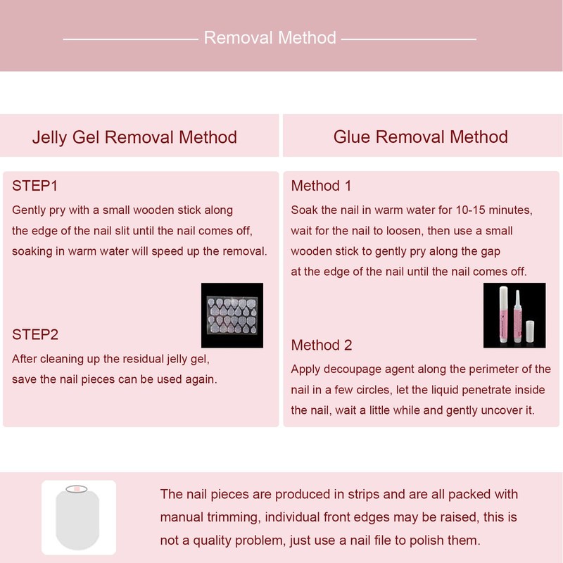 🍁Jelly Gel Removal Method:Gently pry with a small wooden stick along the edge of the nail slit until the nail comes off, soaking in warm water will speed up the removal.