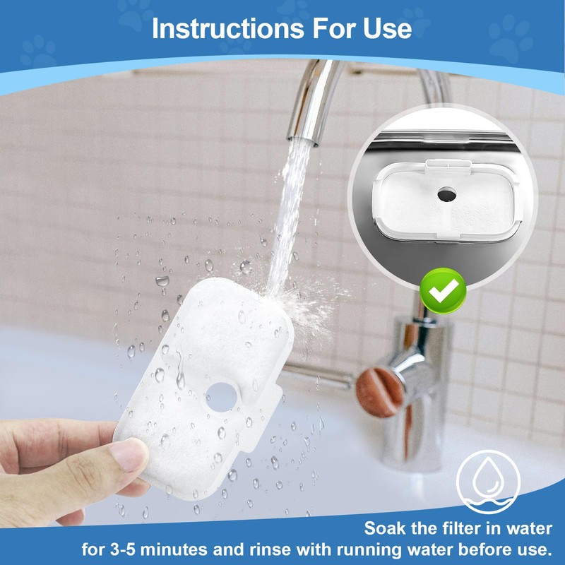 - 【Note】Before use, soak and flush the pet water fountain filter with clean water,clean the filter every time you change the water of the cat fountain, and change the cat drinking fountain filter and sponge every 2-4 weeks.