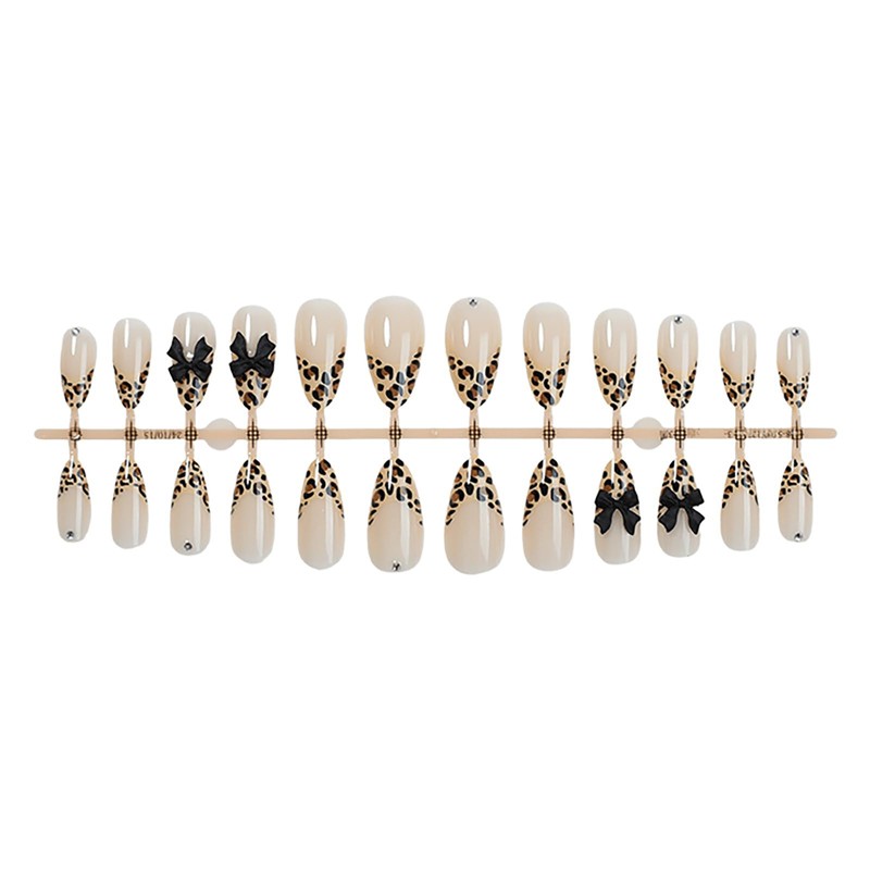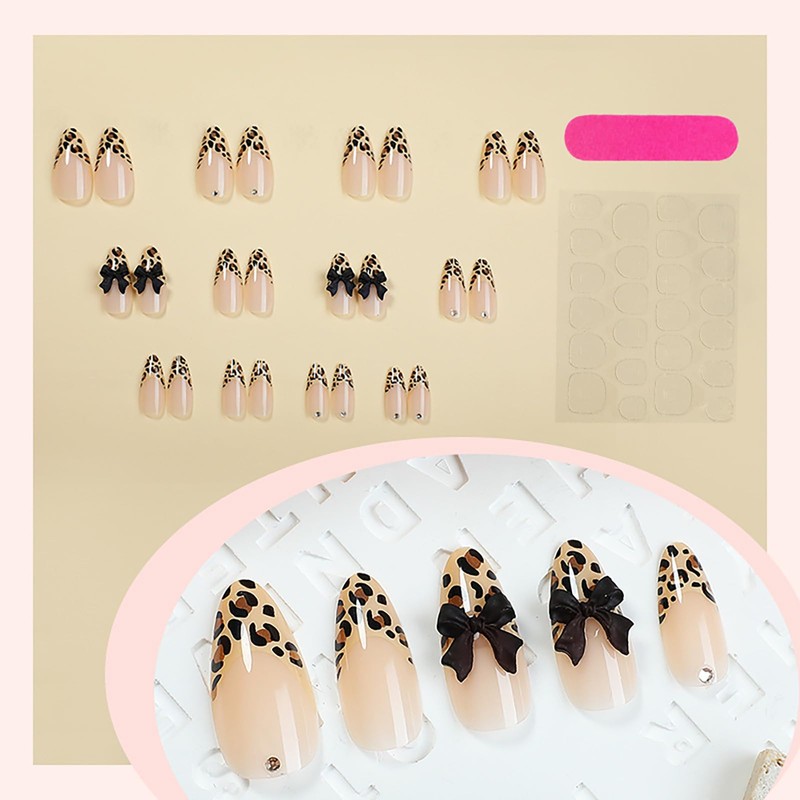 24 Pcs Reusable Almond Press on Nails Medium Fake Nails Leopard French Tip False Nails with 3D Bow Design Cute Acrylic Nails Press ons Holiday Glue on Nails Full Cover Artificial Nails for Women