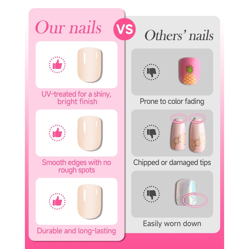 - 【Salon-Quality False Nails Kit】We aim to provide you with a revolutionary nail experience—no nail polish, UV lamps, or drying time required. Achieve salon-quality nails in just 5 minutes. Our press on nails are meticulously handcrafted using a gel process that makes them soft and flexible, ensuring zero pressure on your nail beds for ultimate comfort