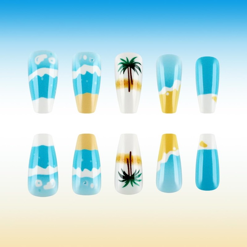 24 Pcs Summer Press on Nails Medium Coffin Square,LINMEIZAI Blue Fake Nails Press ons Beach Waves Nail Tips Glue on Nails Full Cover Acrylic Nail Art Kit False Nails with Coconut Tree Design for Women