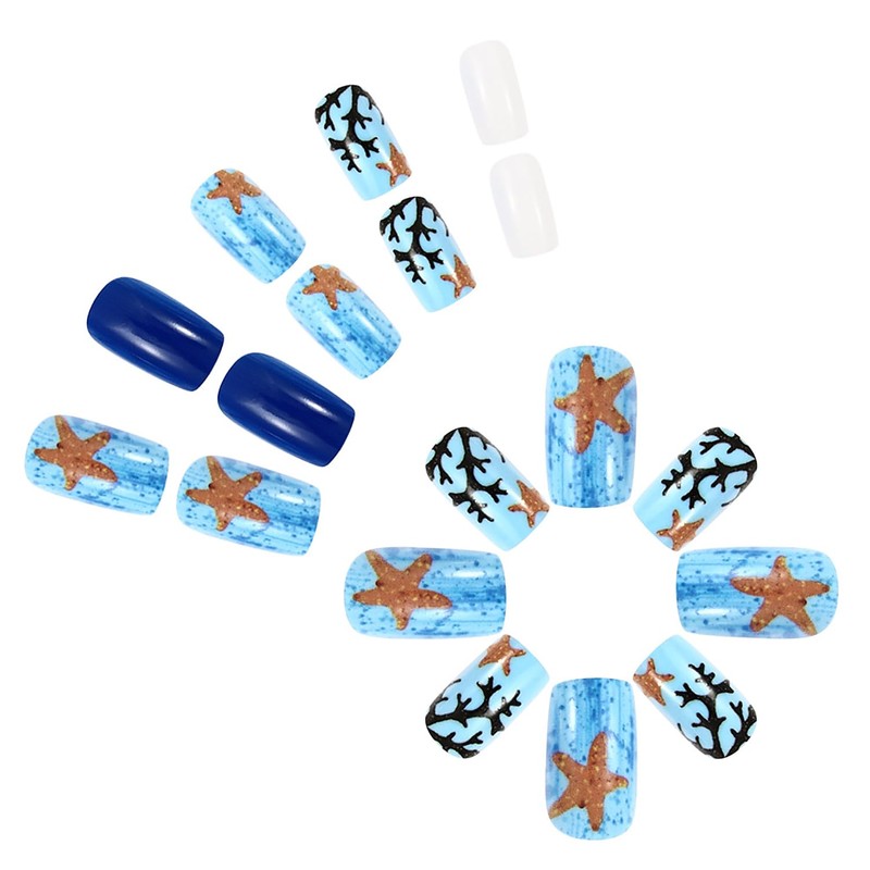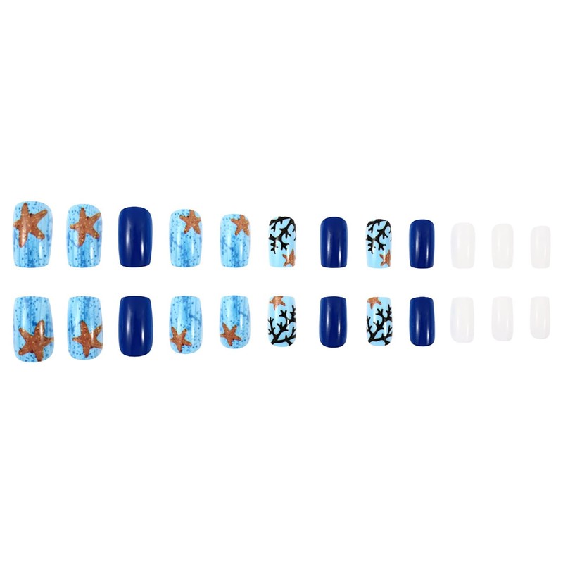 24 Pcs Summer Press on Nails Short Square Fake Nails Blue False Nails with Water Grass & Starfish Designs Ocean Series Glue on Nails Reusable Nails for Women Manicure Art