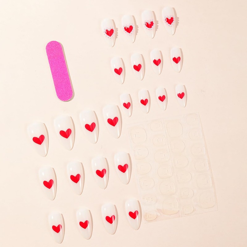- 🧡【Package】You will get 24 pieces of heart press on nails for the valentines party. 24pcs nail adhesive tabs, 1pcs nail file, and 1pcs wooden stick. Don’t forget to choose your nail glue (More durable).