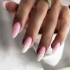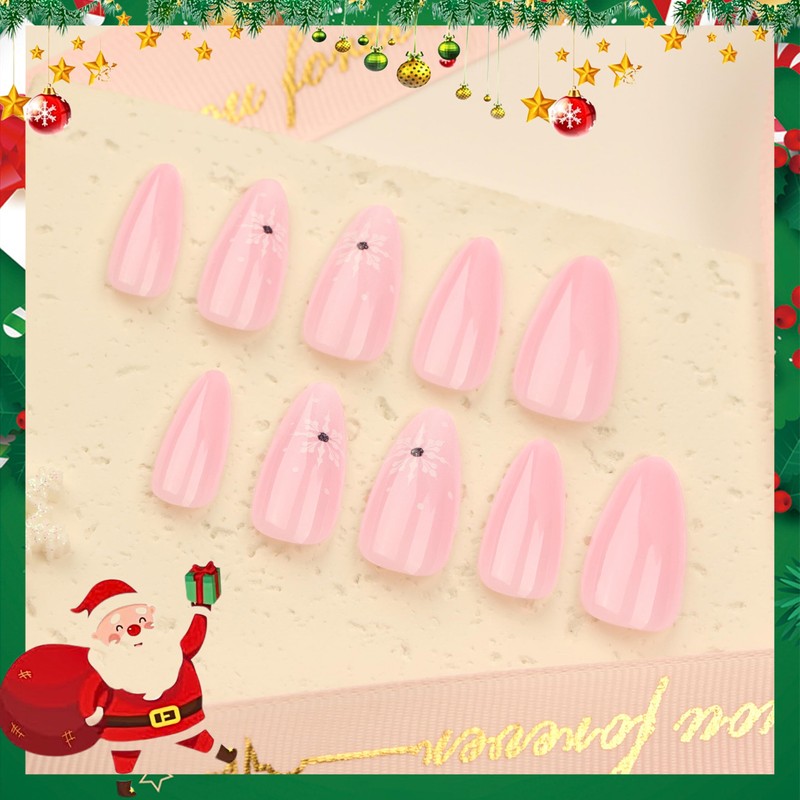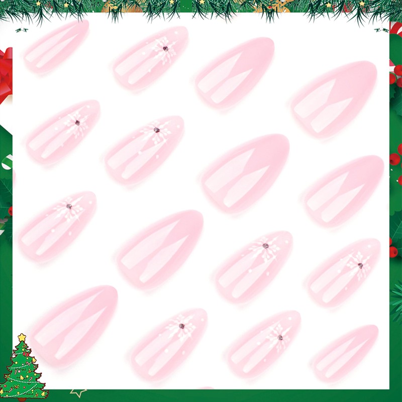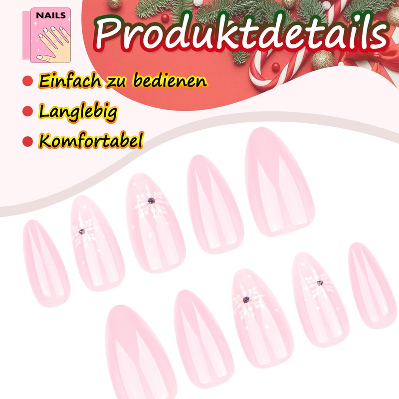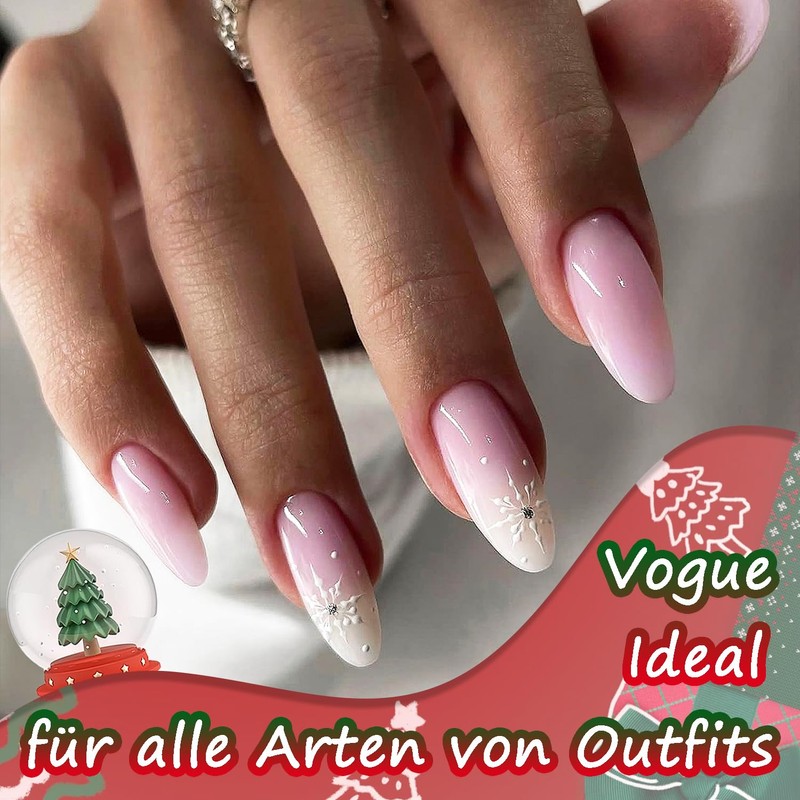 - Christmas nail design: short almond shape with festive pink/white colour gradient and snowflake design give your look a special, winter touch. These false nails combine timeless elegance with festive charm and are perfect for any Christmas party or winter event. Ideal for women who want to accentuate their stylish and refined taste.
