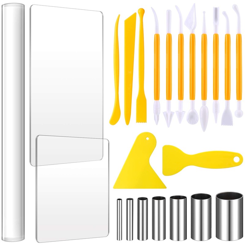 24 Pieces Clay DIY Tool Set, Acrylic Clay Roller, Acrylic Sheet, Plastic Scraper Backing Board, Stainless Steel Round Circle Shape Cutter, Plastic Polymer Clay Shaping Tool for DIY Craft (Yellow)