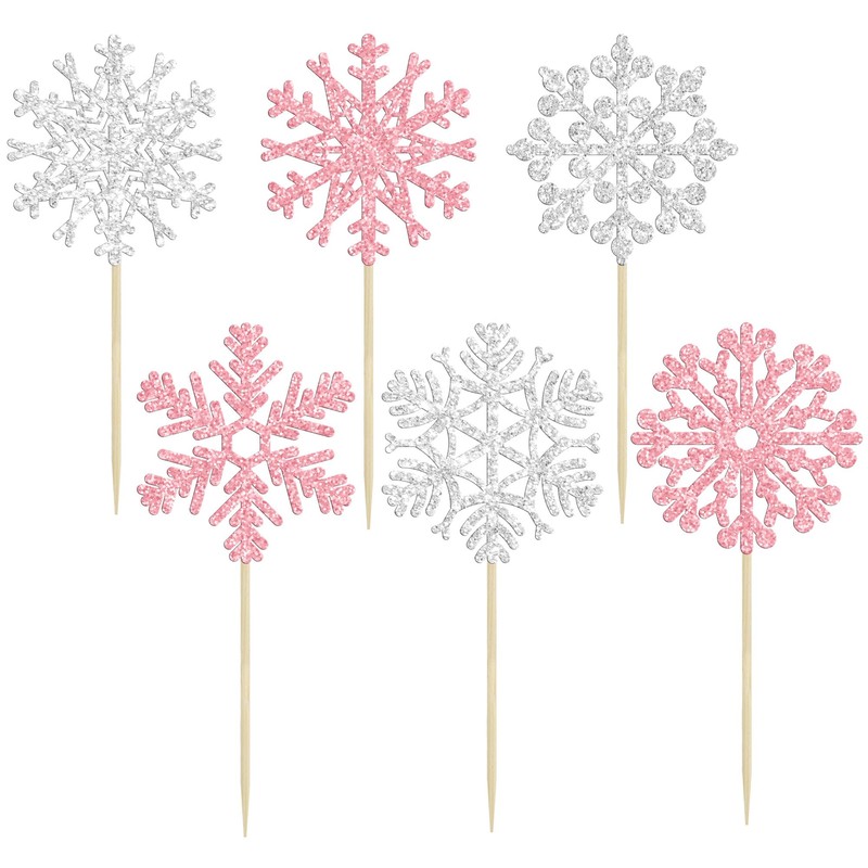 24 piezas de adornos de copos de nieve para cupcakes de copo de nieve de invierno con purpurina rosa y plateado, adornos de pasteles congelados para baby shower, niños, cumpleaños, fiesta de Navidad, decoración de pasteles