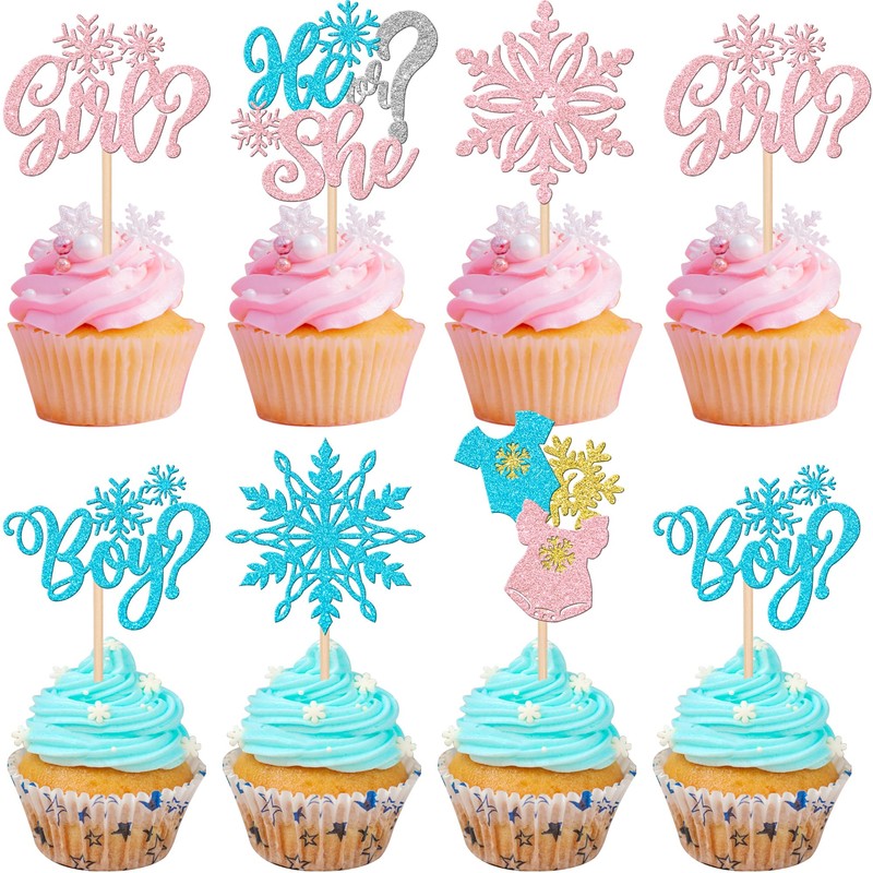 Perfecto para fiestas temáticas de revelación de género, fiesta temática de copo de nieve de invierno, fiesta temática de niño o niña, fiesta temática de baby shower, suministros de decoración de cupcakes.