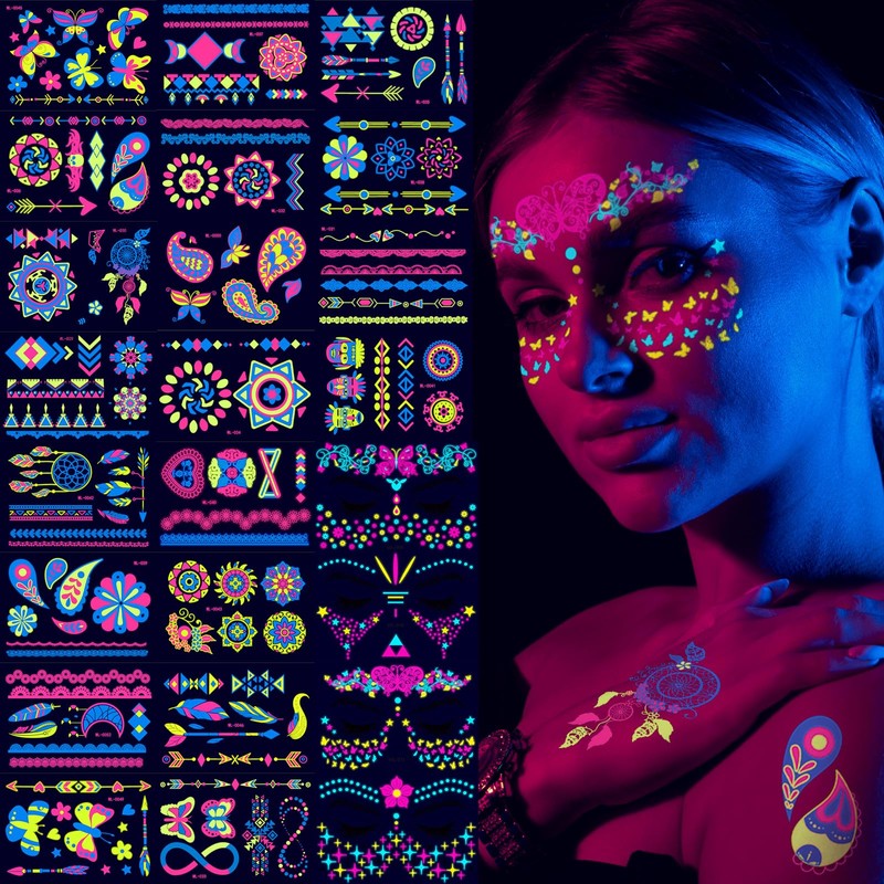 24 Sheets Neon Face Paints Glow in Dark, Fluorescent Tattoo Glow in The Dark Stickers, 180 Individual Patterns UV Neon Party Accessories for Women, A