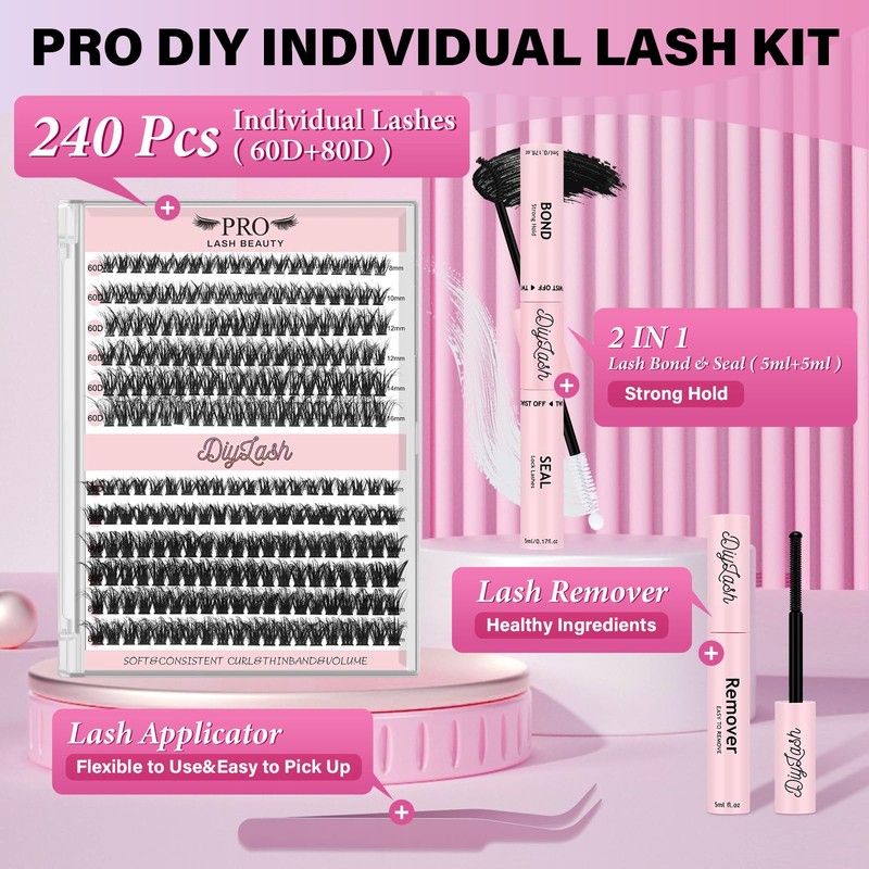 240 Pcs Cluster lashes Kit with 3D Lash Clusters Lash Bond and Seal Lash Tweezers Lash Remover Easy to Apply at Home (60D+80D-D-8-16mix Kit)