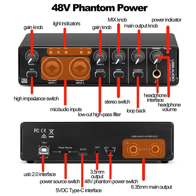 48V Phantom Power: Enabled at the XLR socket for powering condenser microphones, USB audio interfance ensures high-quality sound capture