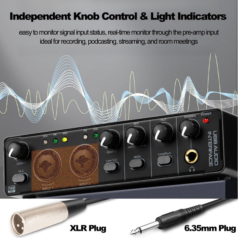 24Bit 192kHz Audio Interface, 2 In 2 Out USB Audio Interface for Recording, Streaming, Podcasting with Pro Audio Mixer, Mic Preamplifier, XLR TSR TS Ports, 48V Phantom Power