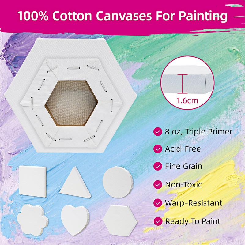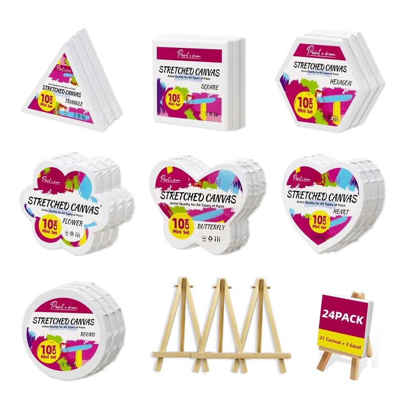 - 💎【 Art Stretched Canvas 】24 pack of Pre-stretched Canvases for Painting, Including Square Canvas, Round Canvas, Heart Canvas, Hexagon Canvas, Triangle Canvas, Flower Canvas, Butterfly Canvas and Easel. Ideal for Easel use or Display on the wall, Offering Versatility for Different Art Projects