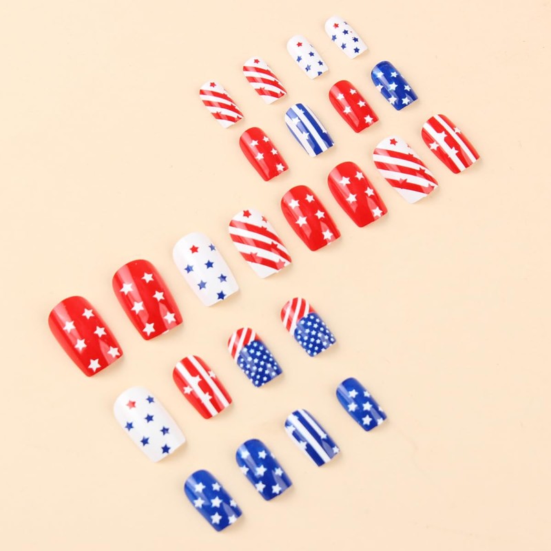 24PCS 4th of July Press on Nails Short Square, Independence Day Fake Nails, Blue White Red Acrylic Full Cover False Nails with Star Stripe Design July Fourth Artificial Nails Glue on Nails for Women