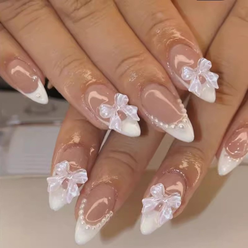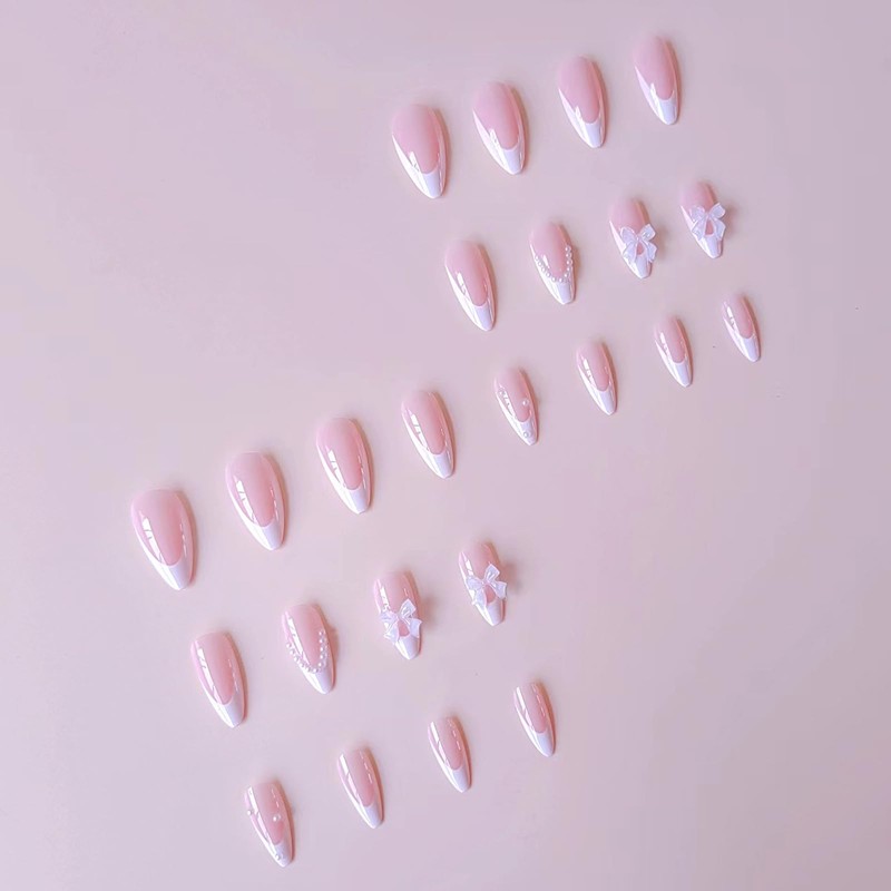 24pcs Almond Nails French Tip - False Nails with Bow - Elegant Press on Nails French Tip with Small Pearl - False Nails with Glue Glossy Full Cover Removable Nail Art Gifts for Women