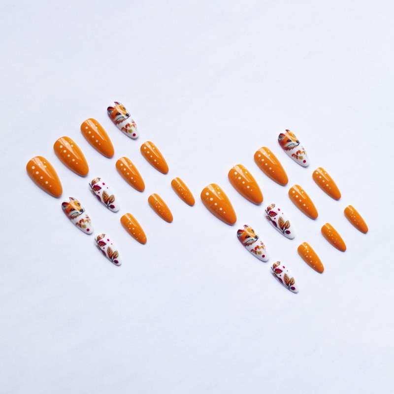 24Pcs Almond Press on Nails Maple Leaves Fake Nails Fall Cute False Nails with Fox Designs Full Cover Glossy Stick on Nails Autumn Glue on Nails Acrylic Nails for Women Manicure Kit
