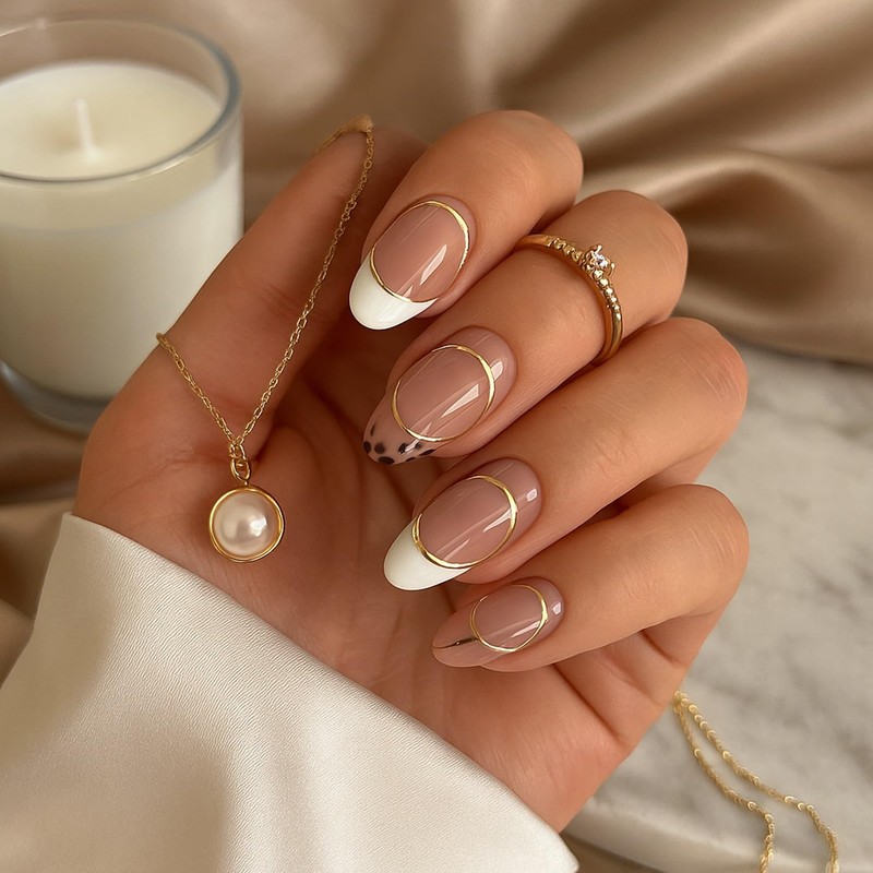 - 🌟 [Modern Y2K Chic Design] These almond press-on nails feature a trendy nude base with metallic gold lines, subtle leopard accents, and a touch of asymmetry—perfect for showcasing a Y2K-inspired elegant style that stands out with minimal effort.