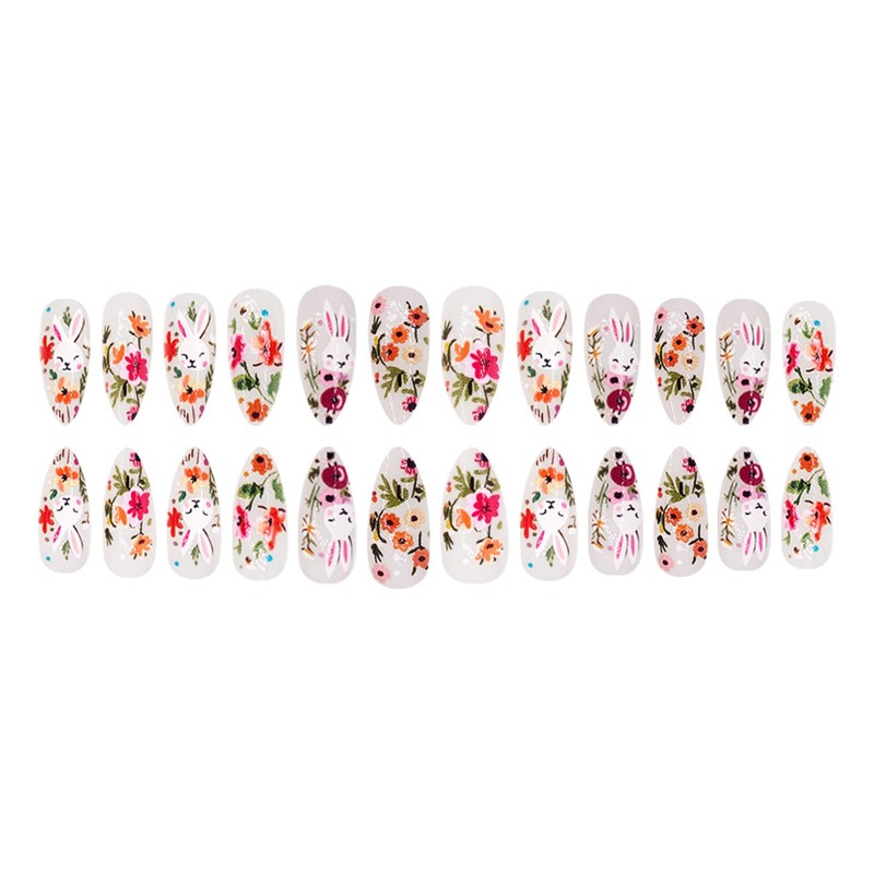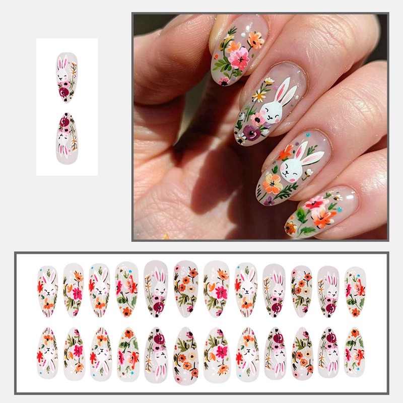 24Pcs Easter Press on Nails Medium Almond Fake Nails Cute Bunny Flower Design Acrylic Artificial Glue on Nails Set Full Cover Light White Spring False Nail for Women Girls (A)