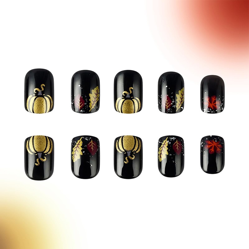 24Pcs Fall Press on Nails Square - Glossy Fake Nails Maple Leaf & Pumpkin Designs, Artificial Stick on Nails, Reusable, Full Cover Suitable for Women Girls DIY Nails