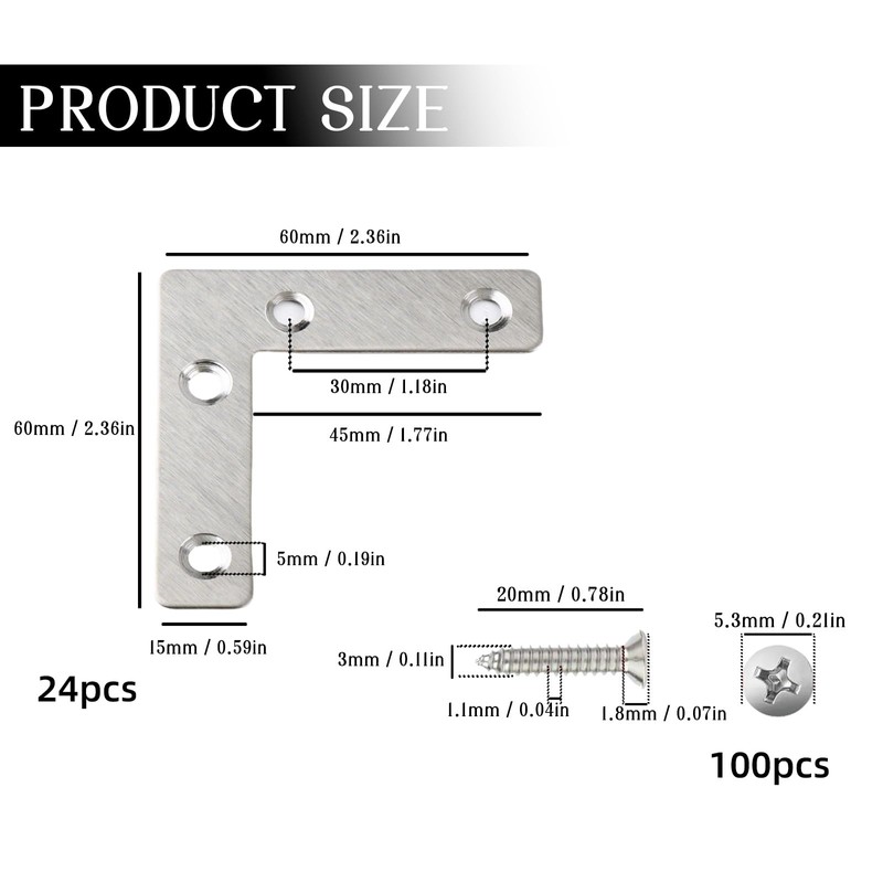 - Complete Kit for Convenience: This set includes 24 L-shaped metal brackets, each measuring 60mm x 60mm, and 100 screws. It’s the perfect solution for all your reinforcement needs, whether you’re repairing furniture, building new shelves, or working on wood projects