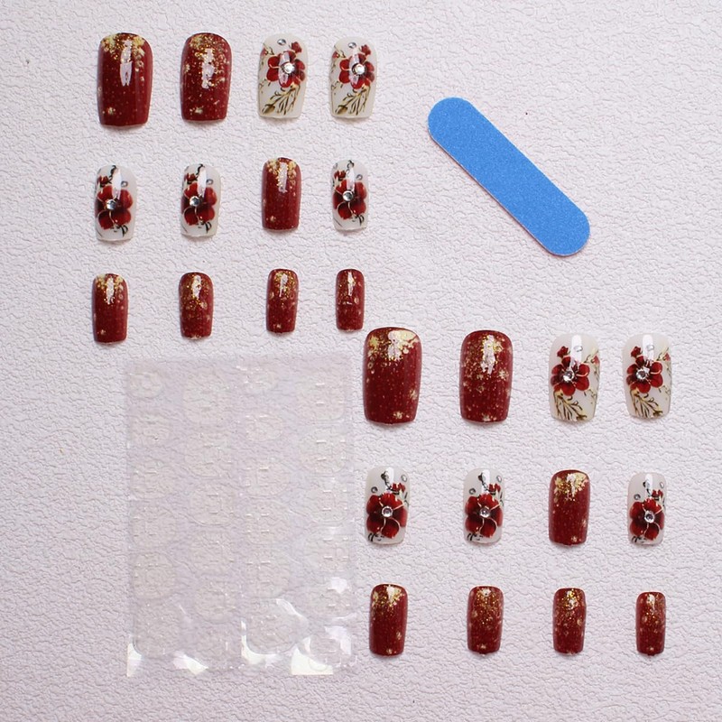 - Spring Nails: You will get 24 pieces flower press on nails in 12 sizes,1 piece mini nail file, 24 pieces nail double-side stickers, 1 piece wooden stick for removing nails tips. Jelly glue is not as durable as liquid glue, but it makes red fake nails reusable. Please use suitable glue according to different scenes